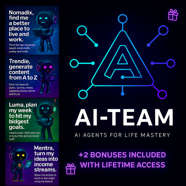You’ll get your very own squad of 5 powerful AI agents - each designed to help with a key part of life or business. From planning and growth to content and clarity - they’re here to save time, reduce stress and help you thrive.